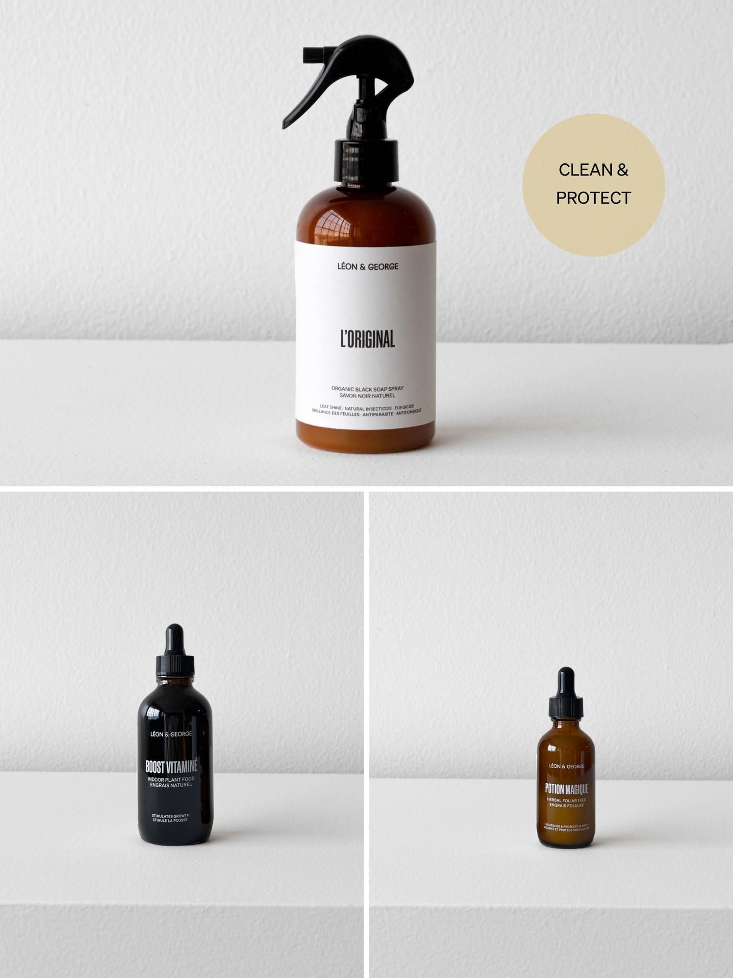 From organic plant food to natural leaf shine, our original set of houseplant essentials was designed to keep your plants clean, insect free and ready to grow. Inspired by the tradition of soaps and perfumes crafted in the south of France, you and your plant alike are sure to enjoy this set of luxurious elixirs. This trio includes L’Original - Black Soap Spray & Insecticide, Boost Vitaminé - Organic Plant Food