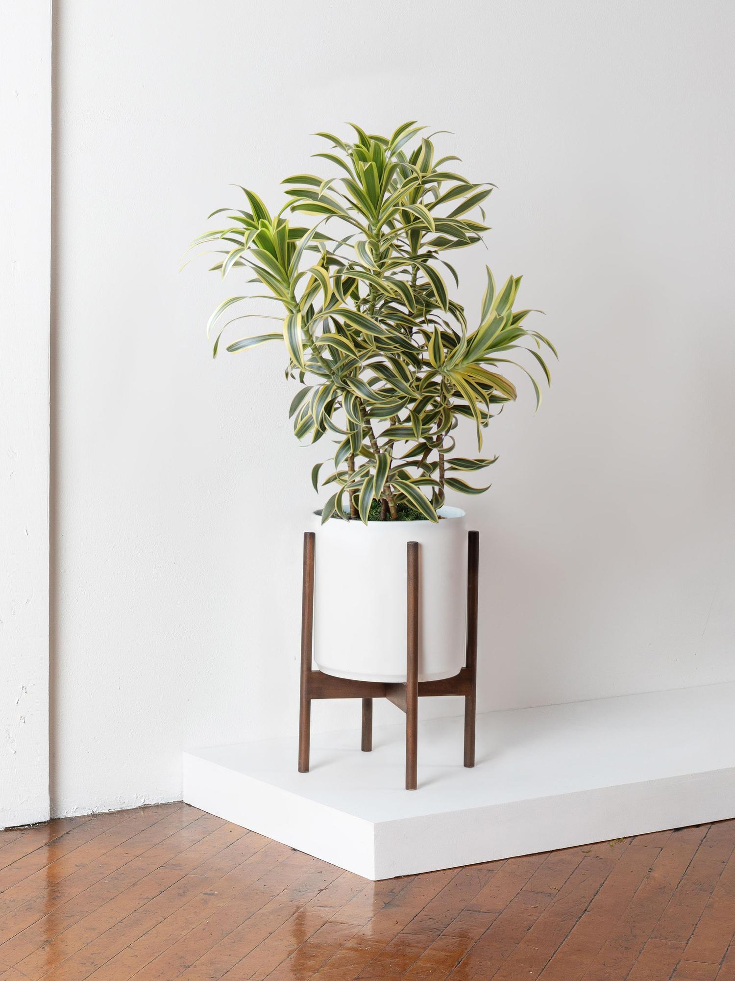 Our Mid-Century collection pairs high-fire ceramic pots with reclaimed wood stands, offering a nod to classic design with a focus on sustainability. Teak is used for light and dark stands, while black stands feature durable mahogany, underscoring our commitment to sophisticated indoor gardening and environmental responsibility. Designed and engineered with form and function in mind, these pieces are perfectly sized, water sealed, surface safe, and made from non-toxic materials.