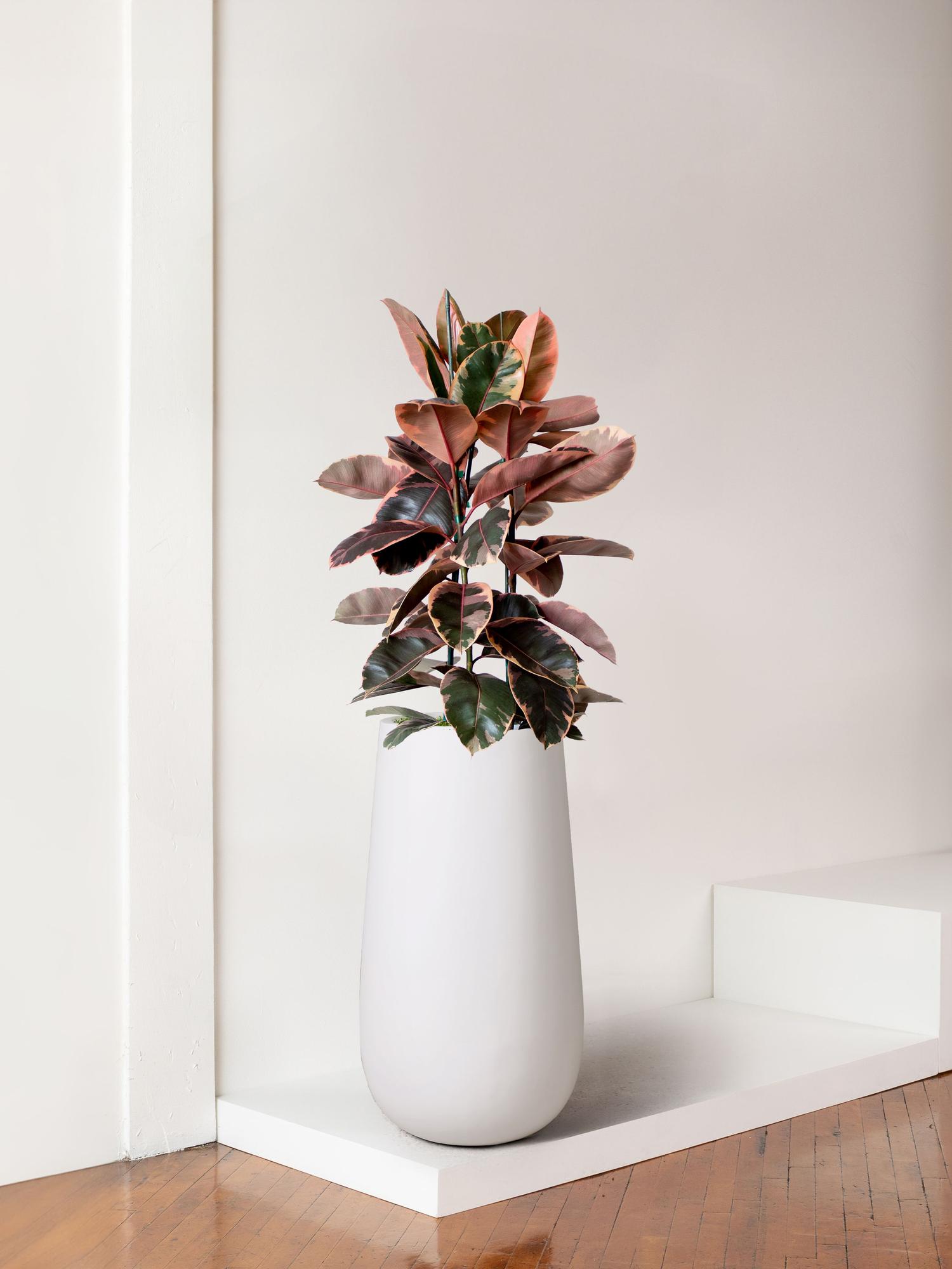 After staging the Ruby Rubber Tree within the planter, Flute adds 23.1” to overall height.