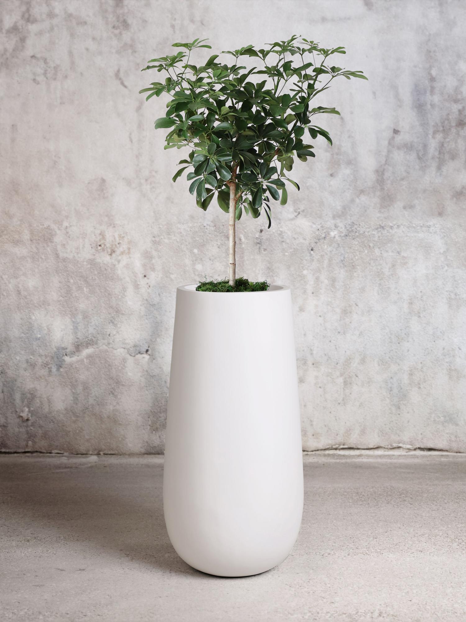 A gorgeous statement tree with an air-purifying punch, the Schefflera is renowned for its abundant canopy of oval leaves that grow in circular, umbrella-shaped configurations. Hardy and resilient, the Schefflera needs watering only when its topsoil is dry, and thrives in medium to bright indirect light.