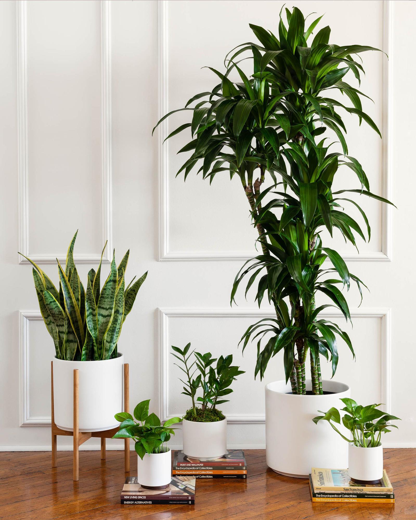 Includes five statement and accent plants paired with white Mid-Century ceramics and hand-finished hardwood accents.
